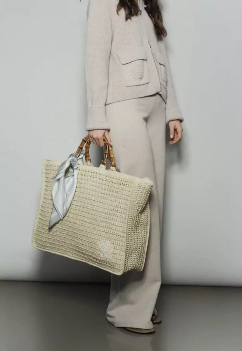 Kristine stråveske er en stor stråveske med bambusinspirerte håndtak og en subtil monogramdetalj. Sideknapper lar deg justere størrelsen, noe som gjør den perfekt for helgeturer eller daglig bruk. Et stilig og allsidig tilbehør for enkel stil.