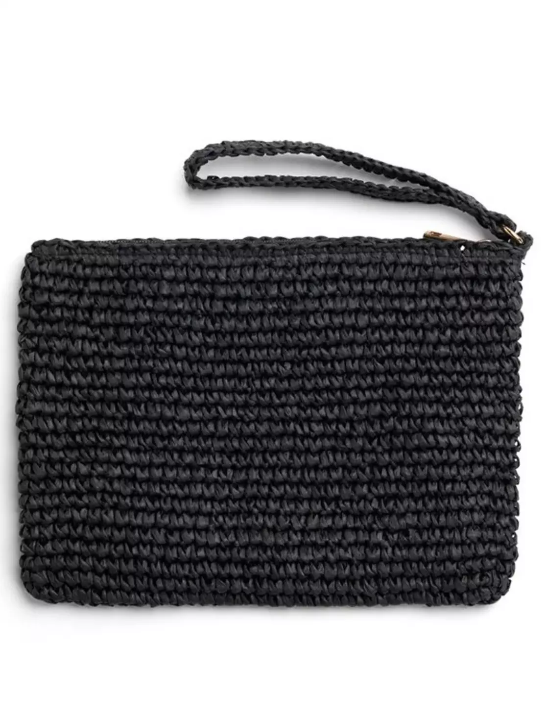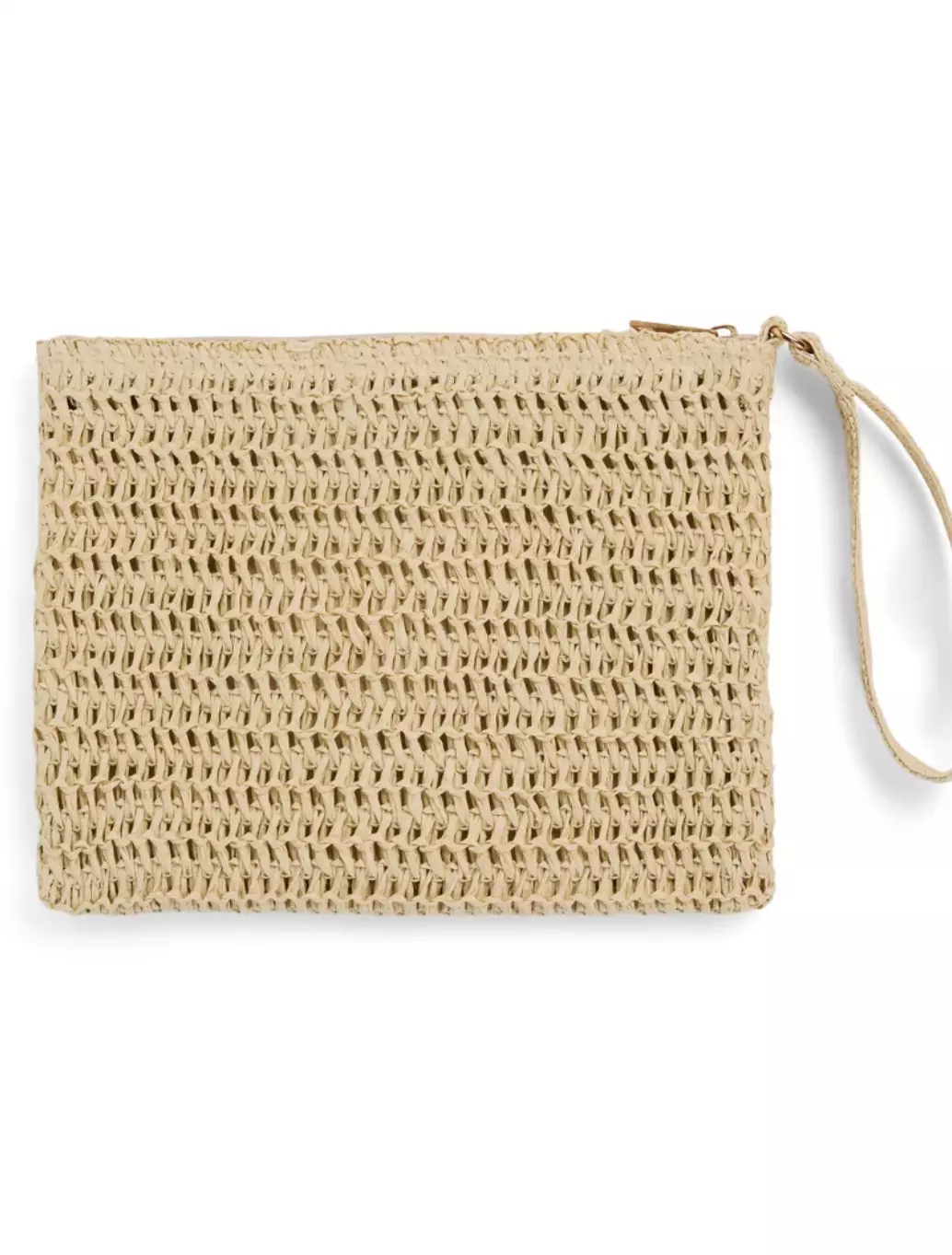 Straw clutch med glidelås og håndtak på siden. foret med 100% bomull og har en stor lomme.