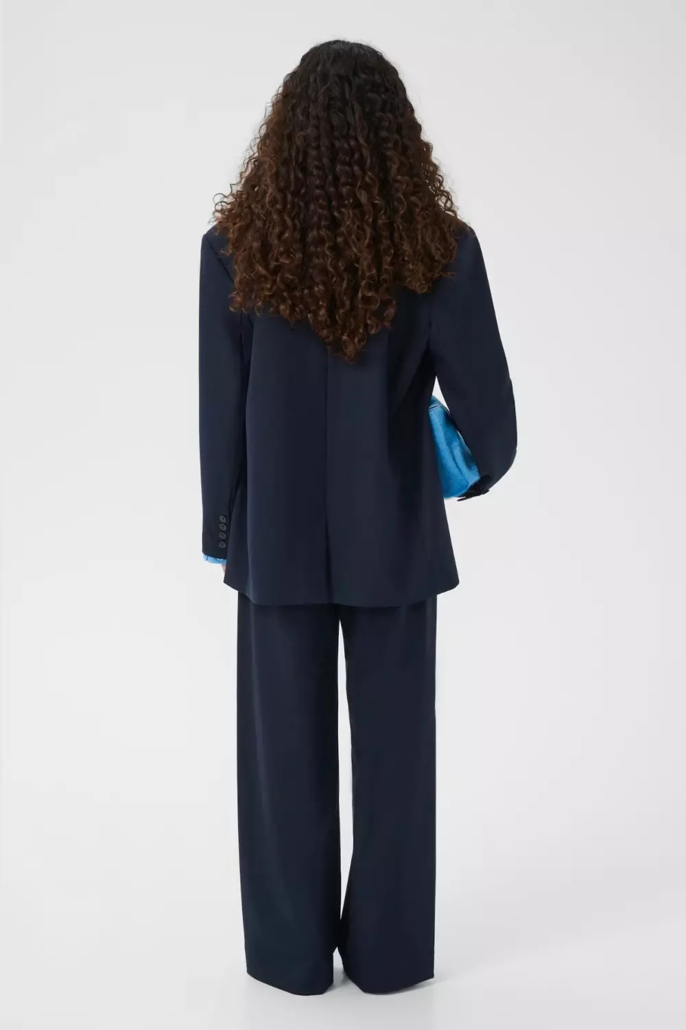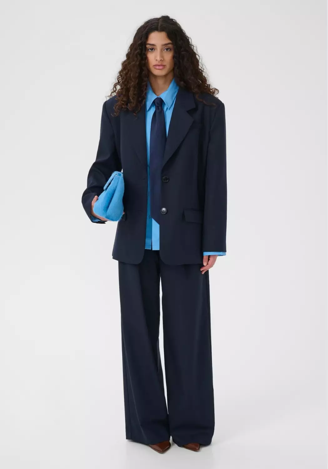 Vide dressbukser med myke legg foran, middels høy midje og beltestropper. Praktiske sidelommer og enkel baklomme gir et rent og stilfullt uttrykk. Modellen er 176 cm høy og har på seg størrelse S/36.