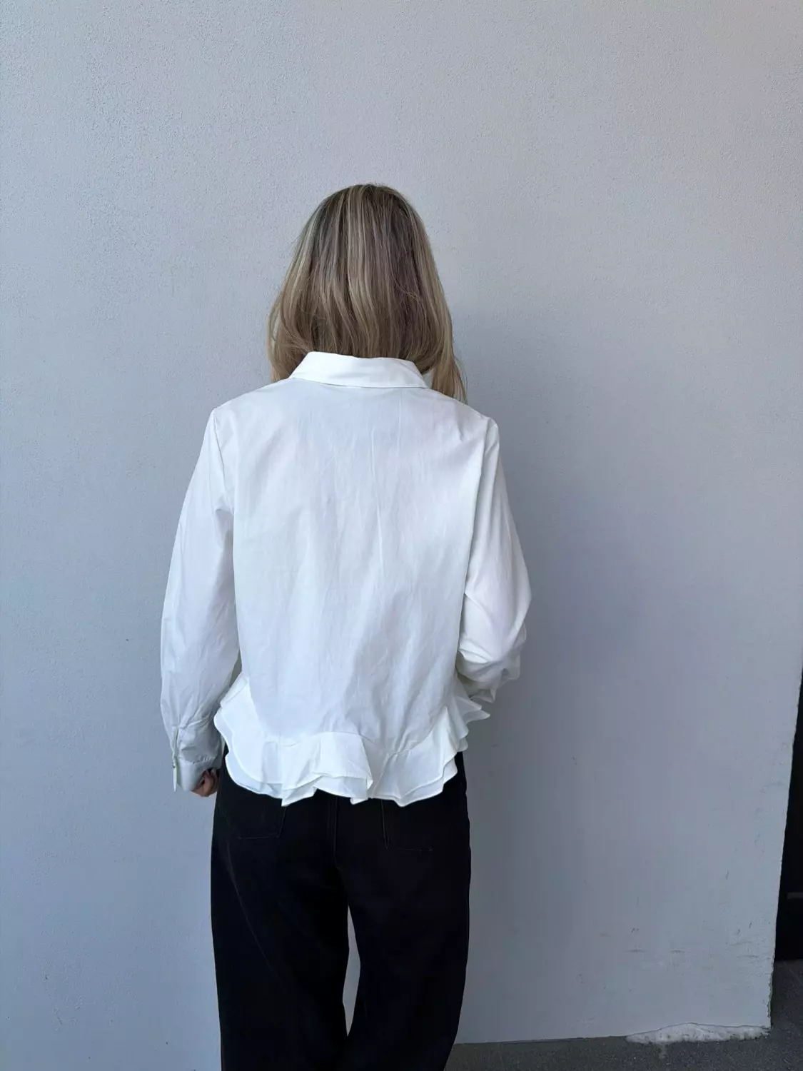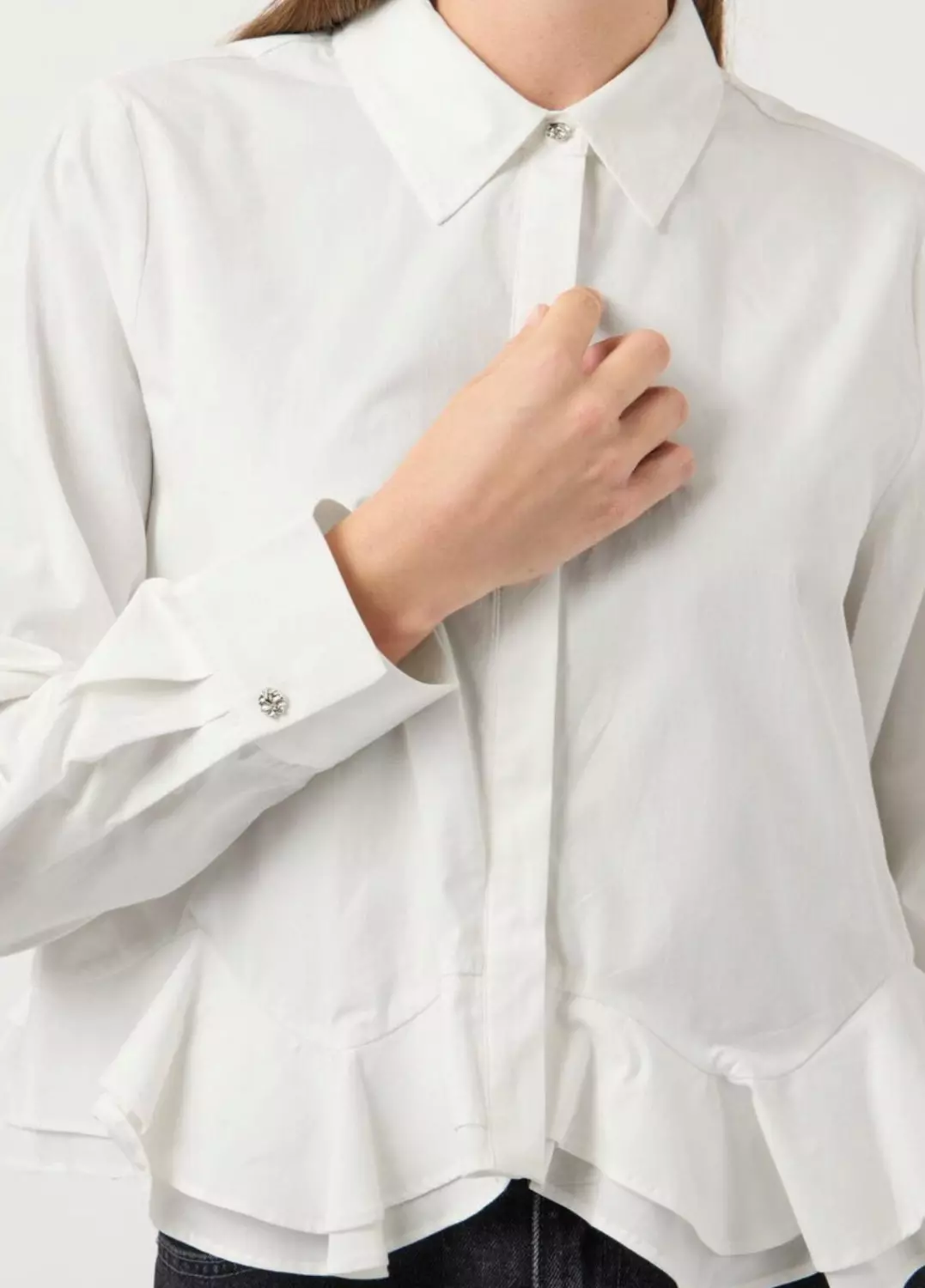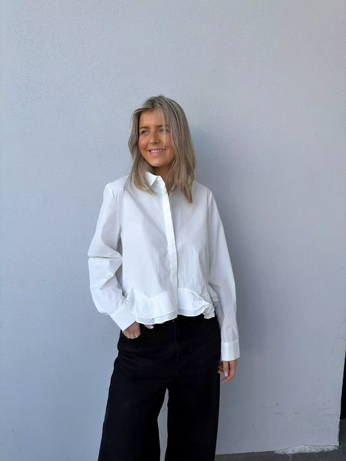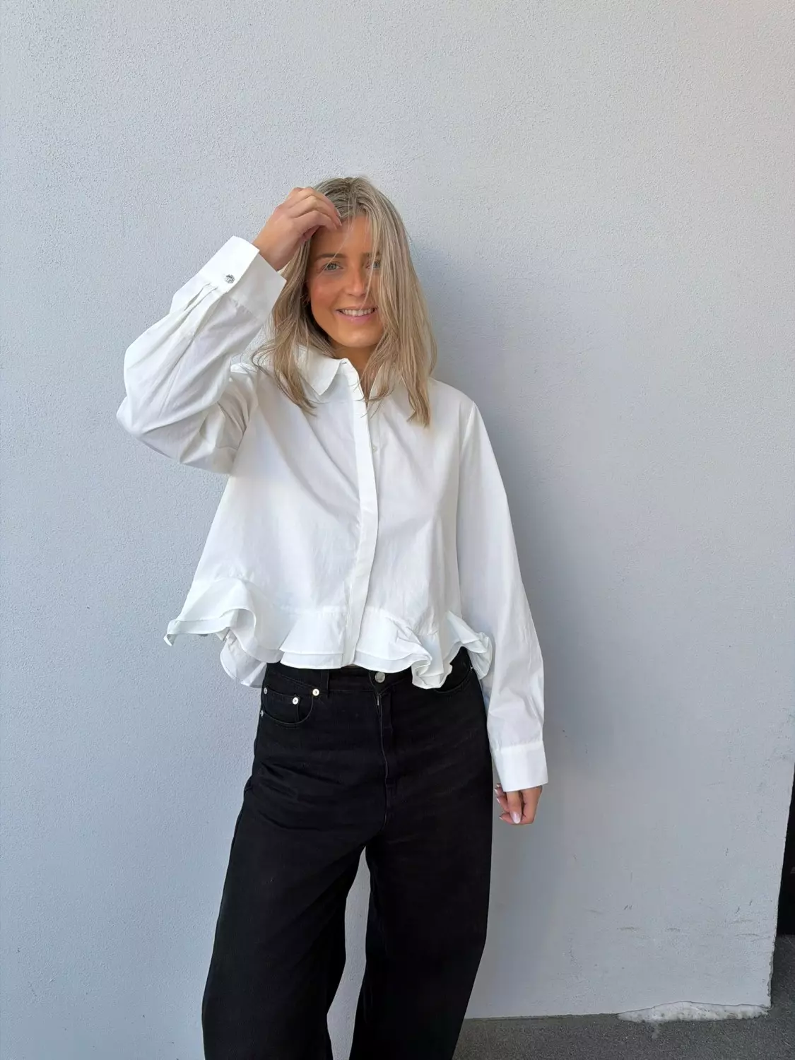 En nydleig bluse fra Yas med volang nederst. En sølv knap i halsen og nederst på mansjetten. Rett i fasongen.